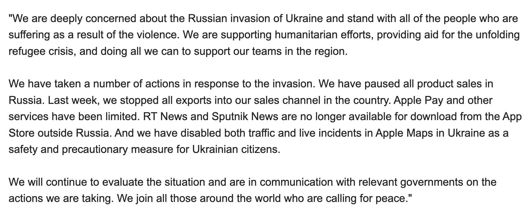 • Also, the company will not show traffic jams and other information in Apple Maps in Ukraine because it may help the enemy — Russia.